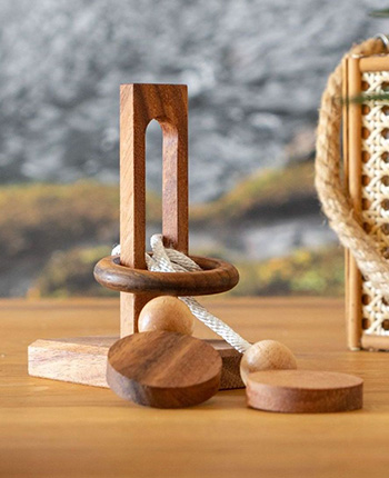 Todo lo contrario que el magnífico rompecabezas de la izquierda, que lleva tantos años en mi despacho que ni siquiera recuerdo cómo llegó. En algún sitio lo he visto descrito como el puzle «Tong-Tang», imagino que aludiendo a su probable, y ancestral, origen chino. Sospecho que el nombre es tan fake como «Fu-Manchú» o «ping-pong», aunque sin duda lo prefiero al de «Señor del Anillo», que también se usa. En la foto el aro aparece medio enredado en la cuerda, pero lo suyo es que te lo encuentres abajo, sobre el taco horizontal, y el reto consiste en extraerlo del todo del artilugio, lo que parece imposible porque las bolitas que hay en el cordón evitan que este pueda sacarse por el orificio central.